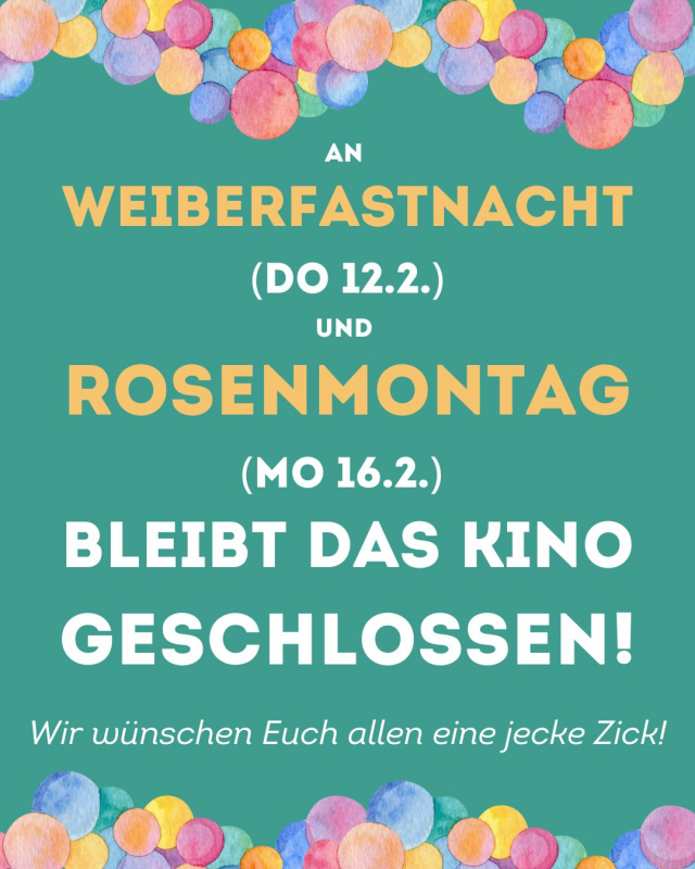 An Weiberfastnacht (12.2.) und Rosenmontag (16.2.) bleibt das Kino traditionellgeschlossen.